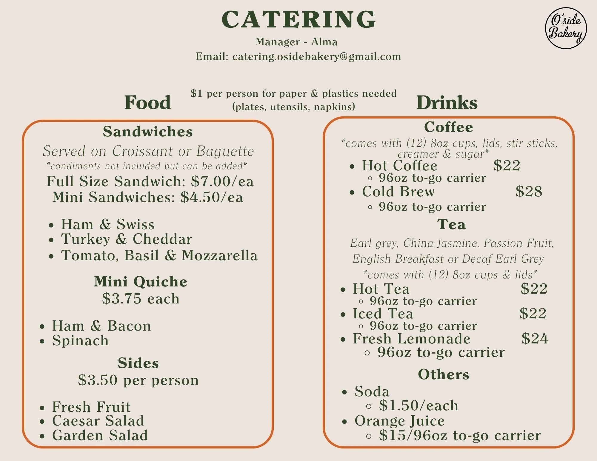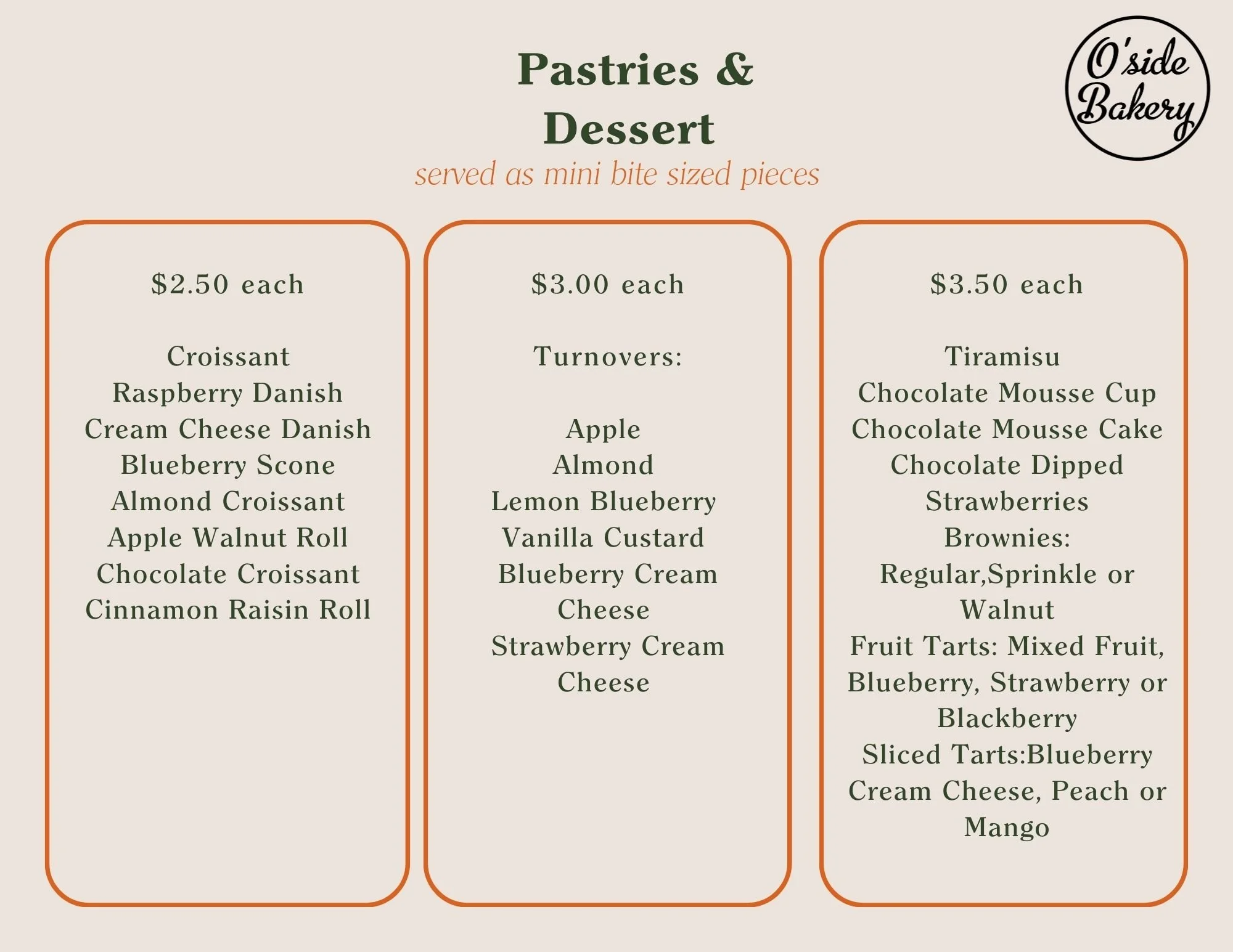 We offer an array of pastries, cakes, tarts and pies. To place an order please call us @ (760) 305-9500